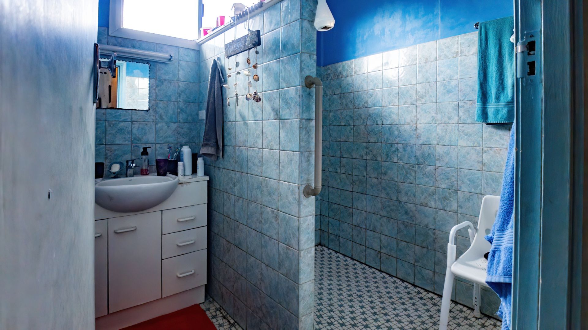 • Easy-to-maintain bathroom with tiled walls and a separate toilet